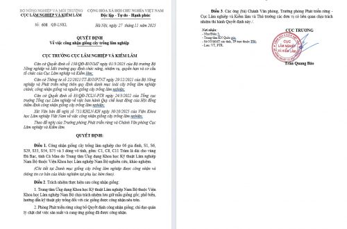 - Công nhận giống cây trồng lâm nghiệp cho 03 dòng Keo lá tràm: Clt57, Clt26 và AA1 cho vùng Đá Bạc, tỉnh Cà Mau do Viện Khoa học Lâm nghiệp Nam Bộ nghiên cứu, khảo nghiệm
